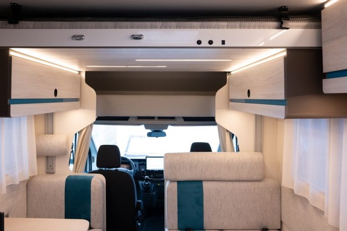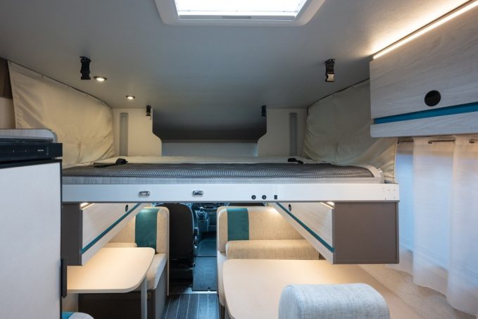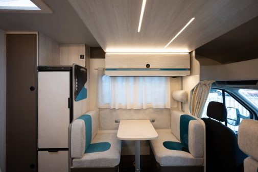 Pour l'occasion et histoire de marquer un peu plus le coup, Rimor a décidé de loger sous la capot moteur, le bloc de 165 ch associé qui plus est à la boîte automatique. A bord, les occupants bénéficient de couchettes superposées installés en partie arrière de manière transversale. Ces deux couchettes sont associées également à la présence d'un lit de pavillon. Nous arrivons donc à 4 couchages. Pour les trois autres places, il faudra convertir la double dînette en couchettes double pour l'une et simple pour l'autre.