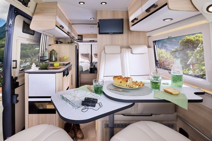 Seul représentant de la gamme vans de Campérêve, le nouveau Cap Land sur Ford Custom, avec sa banquette transformable électriquement, a fait parler de lui dès sa présentation. Il faut reconnaître que le système, depuis vu sur d’autre vans du groupe Rapido, a de quoi étonner. Pour le reste, ce Cap Land “II” reprend les caractéristiques qui ont fait le succès de son prédécesseur, à commencer par les sanitaires à l’arrière (WC intégré et bac à douche dans le plancher secondé par une chaussette en plastique faisant office de cabine) et la cuisine disposée à l’entrée, comme dans un fourgon, et prolongée par un pouf.