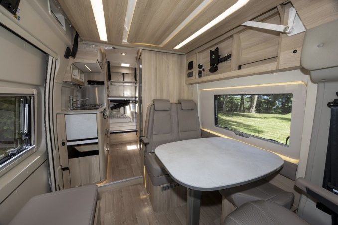 Cette gamme est composée de deux fourgons sur Fiat Ducato H3 (2,88 m de haut). Le CamperVan XL, uniquement disponible en finition Saphir, dispose d’une casquette spécifique avec skyroof et d’un lit de pavillon en dînette électrique qui s’ajoute au lit transversal arrière. Il est en outre équipé d’une salle d’eau en deux parties avec penderie pivotante Modul’Space. L’autre modèle, le Family Van, se contente d’un lit de pavillon en dînette manuel, mais il joue à fond la carte familiale avec ses 5 places carte grise et nuit (deux lits solos superposés à l’arrière plus un lit de dînette, ci-dessous) et propose une salle d’eau modulable via une paroi. Cette année, la cinquième place route a été repensée. Toujours installée dos au sens de la marche, elle est aujourd’hui plus facile à mettre en place grâce à un dossier repliable intégré (et non plus un élément rapporté à enficher). La ceinture reste cependant une simple ventrale.