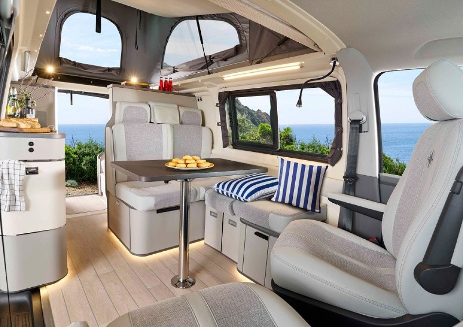 A bord, pas de grands changements. Nous retrouvons l’ambiance habituelle des vans de la marque réhaussée, cependant, de coussins rayés blanc/bleu marine, couleur-clichée incontournable de l’univers marin. Cette édition spéciale se caractérise également par la présence d’un store extérieur Fiamma F35 installé de série. Les Kepler One et Six sont concernés. Pour mémoire, le premier repose sur une implantation avec salle d’eau arrière (receveur de douche intégrée dans le plancher et WC à cassette à demeure côté conducteur) et dînette avec banquette en L et cuisine à l’entrée. De son côté, le Kepler 6 se présente comme un monospace de loisirs avec ses sièges indépendants coulissants et amovibles (jusqu’à 6) et son mobilier (cuisine et rangements) logés contre la paroi gauche.