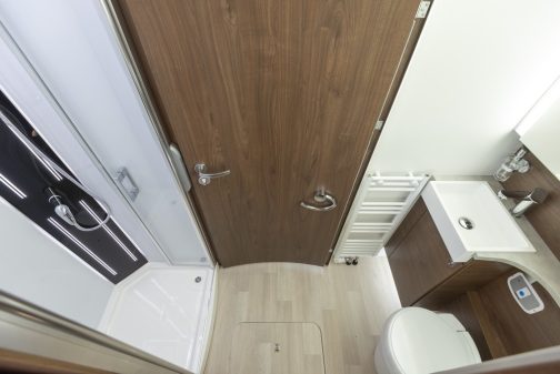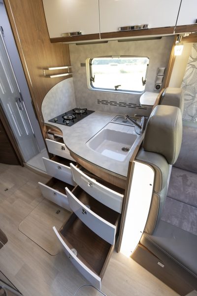 Concocter des bons petits plats ? Facile ! La cuisine MaxiFlex et son plan de travail en stratifié massif sont un modèle du genre. Se faire beau et propre ? La douche, d’une très belle taille, convient à tous et le cabinet de toilette, en face, remplit parfaitement son office. Le confort général se révèle aussi douillet qu’un traversin en plume, grâce à un salon à l’ambiance raffinée, comme en témoignent ses banquettes, mixant cuir et microfibres, et sa chambre à lits jumeaux, flanquée de nombreux placards. Le Platin Pure I 7400 GD est finalement une maison roulante de près de 8 mètres de long !