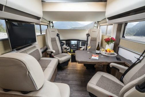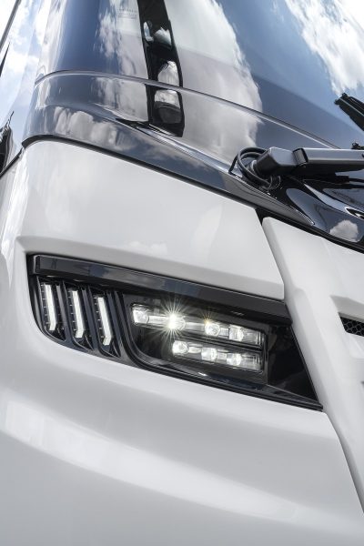Il affiche un design sobre avec une carrosserie à dominante blanc. Pour le châssis, le constructeur a opté pour l’Iveco Daily de 175 ch. En passant derrière le volant, le conducteur pénètre dans un univers cossu et sécurisant, grâce à la visibilité augmentée par les rétroviseurs type Bus.