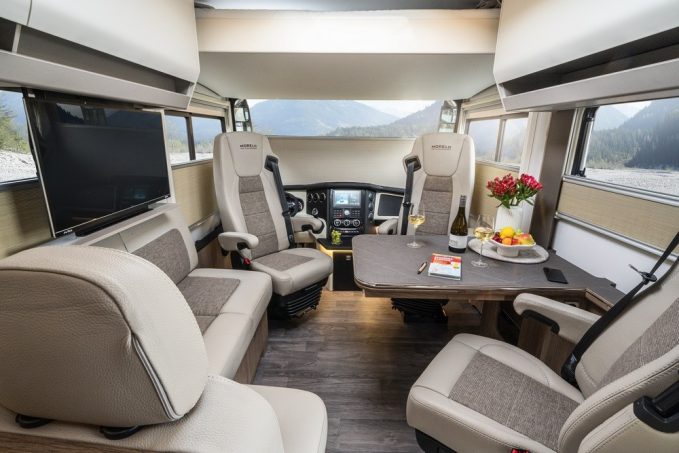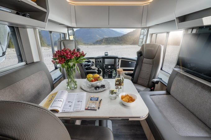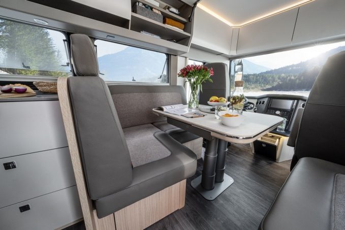 L’espace de vie peut accueillir six personnes. La dînette profite, en option, d’un grand écran de télévision, dissimulé derrière le placard de pavillon. Quant à l’éclairage à LED, il est discret, modulable, efficace et économe en énergie.