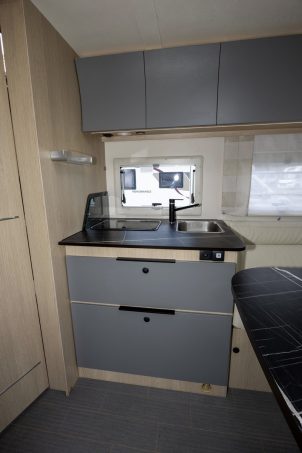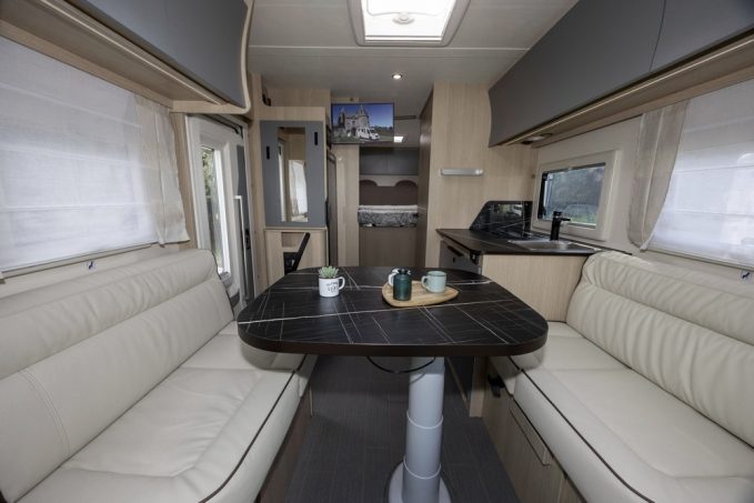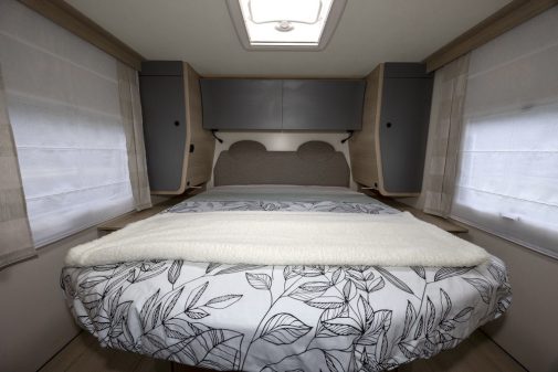 Au sein du catalogue Autostar, où les profilés étroits de la gamme Performance ont pris l’ascendant sur les modèles plus larges, un irréductible modèle continue à résister – à l’image des habitants du petit village d’Astérix face aux Romains – aux “envahisseurs” profilés étroits. Ce vaillant modèle est le P740 LC dans sa livrée Privilège, long de 7,39 m et 2,31 m de large. Sa potion magique à lui, c’est sa chambre, accueillante, dans laquelle est installé un lit central de 150 x 190 cm encadré à sa tête de vaste penderies suspendues et de volumineux placards de pavillon. Un espace des plus confortables qui garantit aux occupants d’y passer de très bonnes nuits. Le principe du lit central étant que l’on peut se lever sans déranger son voisin ou sa voisine. A son pied, au centre de la cellule, nous profitons d’un cabinet de toilette constitué de deux compartiments indépendants, qui peuvent être réunis par un jeu de cloisons et de portes.