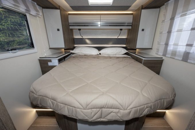 Avec le Magis 67 XT de la marque CI, nous sommes bien loin de la tendance des profilés compacts de 2,15 m de large. Ce long profilé affirme ses formes (7,45 m de long sur 2,35 m de large) et surtout son espace à bord, avant tout généreux. Cela se traduit par la confortable chambre arrière à lit central qui surmonte une vaste soute. Le sommier à lattes de 190 cm par 150 cm est relevable. Sa hauteur se réglant électriquement. De part et d’autre du couchage, se trouvent deux penderies et des rangements qui, tels de petites tables de chevet, pourront servir à déposer un verre d’eau ou un livre (deux liseuses individuelles sont positionnées au niveau de la tête de lit). Une fois couchés, les utilisateurs pourront également compter les étoiles pour s’endormir grâce à un lanterneau de plafond.