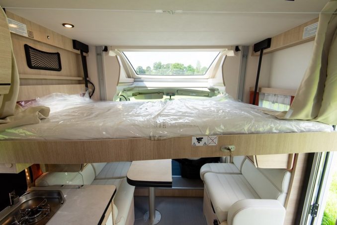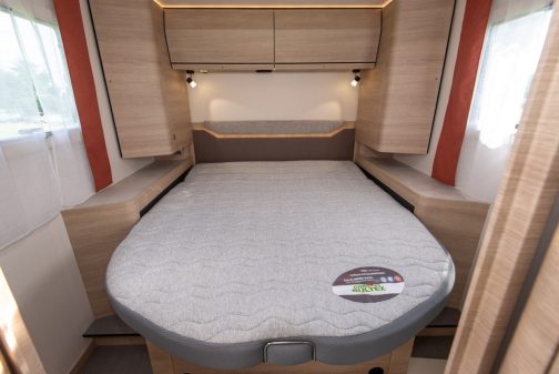 Les acheteurs du 696F ont la possibilité de le choisir avec ou sans lit de pavillon (130 x 195 cm). En effet, ce couchage est disponible en option. Mais ce qui caractérise le plus ce profilé, c’est son lit arrière que ses dimensions de 160 x 196 cm rendent unique. Le 696F est le modèle avec le plus grand couchage permanent. De plus, pour améliorer la circulation dans la chambre, le sommier coulisse, la tête de lit se relève, afin de libérer de la place de part et d’autre. En option, le couchage peut être réglable électriquement en hauteur (pour transformer la soute en garage).
