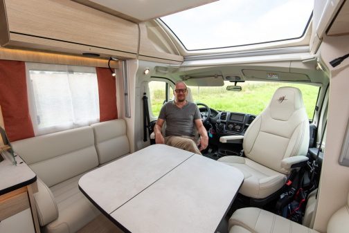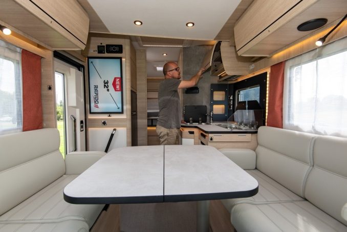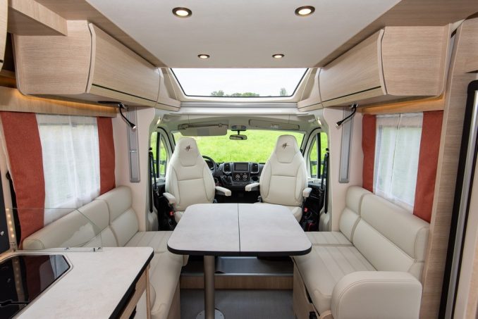 Cela fait une décennie que le 696F est proposé au catalogue Rapido. Au fil des années, ce profilé super star s’est bonifié, un peu comme un grand cru qu’on laisserait vieillir. Car les évolutions subies par le véhicule ont été minimes. L’implantation est parfaitement maîtrisée, chaque poste parfaitement structuré. Le profilé a toutefois vu sa silhouette s’affiner, notamment avec l’intégration d’une casquette plus élancée et flanquée d’un grand et élégant skyview en verre galbé qui laisse passer beaucoup de clarté. Le salon, avec ses banquettes installées de part et d’autre de la table, baigne ainsi dans une agréable lumière.