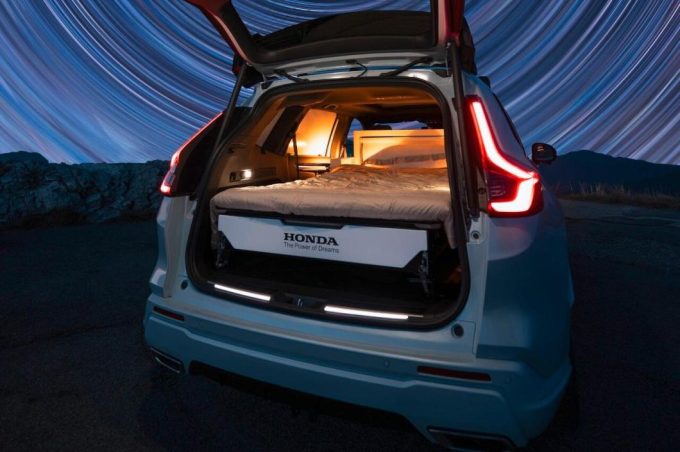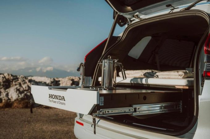 Celui choisi par Honda comporte un tiroir dans lequel est intégré une avec plaque de cuisson, un évier et des bacs de rangement. Sur le dessus du caisson vient se poser un matelas, transformant tout l’arrière du SUV en grand lit pour deux.