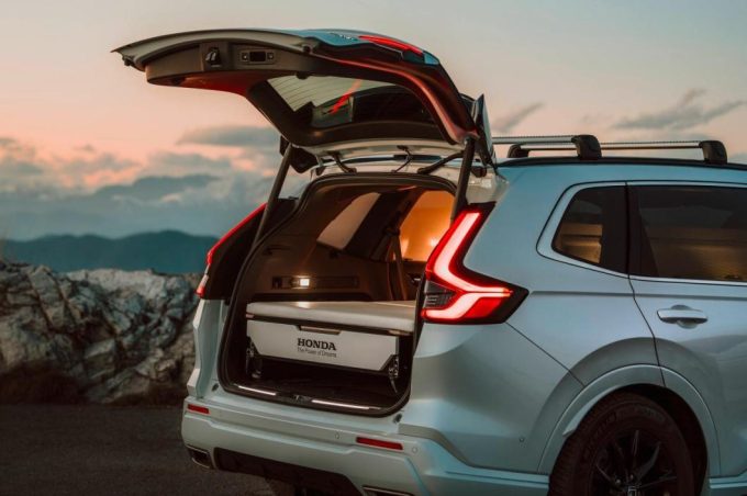 Le CR-V choisi par Honda pour recevoir le kit camping est la version hybride rechargeable. Cette malle est l’œuvre de l’entreprise tchèque Egoé spécialisés dans la fabrication de caissons dont les modèles s’adaptent à plusieurs voitures.