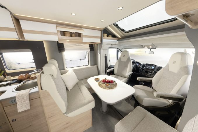 Le salon justement, venons-en, est composé d’une banquette en L, des sièges pivotants de cabine et d’un sofa latéral. Celles et ceux qui préfèrent une version lounge avec banquettes latérales en vis-à-vis, c’est tout à fait possible en choisissant le modèle DBL, lequel coûte 1 000 € de plus que le T7052 DBM dont le prix est 70 990 €.