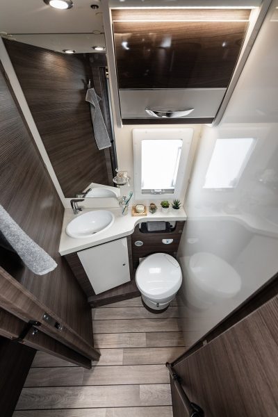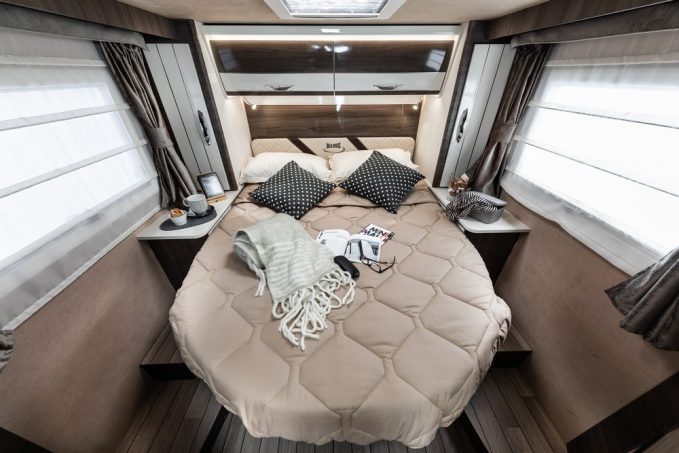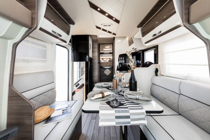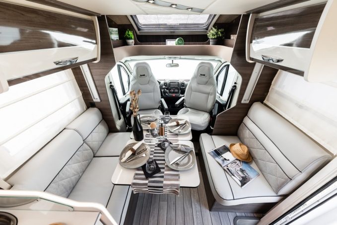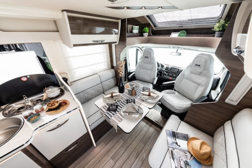 La partie avant est évidemment occupée par le salon avec des banquettes latérales face-face et les sièges de cabine pivotants. Quatre à cinq personnes peuvent aisément tenir autour de la table. Attention, le nombres de places carte grise est limité à quatre. Au-dessus du salon, se trouve un lit de pavillon monté d’origine avec une commande électrique. Un couchage supplémentaire qui n’augmente pas le prix du véhicule, affiché à 75 200 €.