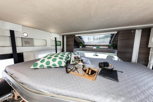 Chez le constructeur toscan McLouis, le Mc4 881 a toujours eu un certain succès, même encore cette saison avec l'arrivée des profilés étroits. Ce profilé de 7,45 m de long adopte une implantation très en vogue. Il est ainsi équipé d’un vaste lit central de 150 x 190 cm, lequel est constitué d’un matelas de mousse suffisamment épais et confortable qui repose sur un sommier à lattes. Ce couchage est réglable en hauteur, ce qui permet de moduler le volume de la soute.