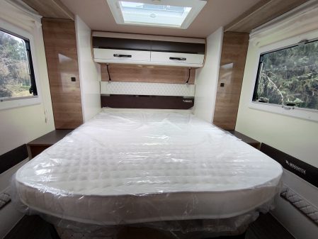 Le lit est entouré d’un cadre habillé d’un très joli cuir écologique blanc mis en valeur par des rampes de LED. Le grand matelas (194 x 150 cm) offre un confort d’autant plus exemplaire qu’il est posé sur un sommier à lattes de bonne qualité, qui se relève pour donner accès à la soute qu’il surmonte. La chambre baigne dans la lumière grâce au grand lanterneau de 70 x 50 cm positionné juste au-dessus du couchage.