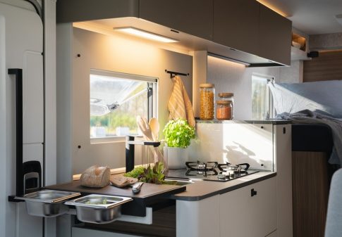 En partie avant de ce Cruiser 740 EL, un salon pour quatre personnes avec banquettes face route et retour en L, sièges pivotants du porteur et une table sur pied central. Du côté de la cuisine, il semblerait que LMC joue la carte de la modularité avec des éléments additionnels qui viennent se mettre en bout du plan de travail afin d'offrir plus d'aisance au cuistot.