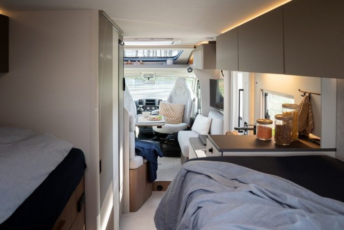 D’après nos informations, cette série va recevoir trois implantations sur 7,47 m de longueur, toutes intégrant des lits jumeaux. Il y aura donc le 740 EL ci-contre se distinguant par la présence d’une salle d’eau avec paroi pivotante et grande cuisine. Pour le reste, ce véhicule adopte donc des couchages indépendants en partie arrière pouvant si besoin être réunis. Il repose sur un sommier dont la partie inférieure est occupée par une grande soute garage.