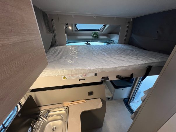 Ces trois derniers profilés, dont la largeur grimpe à 2,32 mètres, ont également la particularité d'adopter un couchage supplémentaire grâce à la présence d'un lit pavillon de série, qu'on déploie manuellement. Mais ce n'est pas tout puisqu'un toit relevable, en option, sera également disponible sur les V600 et V670. "Comme à notre habitude chez LMC, un gros travail a aussi été entrepris sur le poids, grâce, notamment, à notre savoir-faire en menuiserie. Les étagères sont par exemple construites sous forme d'alvéoles", explique un représentant de la marque.