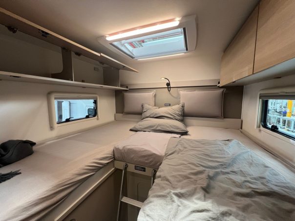 L'occasion de se rendre compte que cette nouvelle gamme dispose de nombreux atouts pour faire mouche, avec des produits pouvant convenir à tous les types d'usages et même séduire, pourquoi pas, si l'envie est là, des utilisateurs de fourgons aménagés à passer au camping-car. C'est par exemple le cas du V600, un profilé étroit s'établissant sur six mètres de longueur et 2,22 mètres de largeur, dont la particularité est d'adopter un lit transversal à l'arrière.