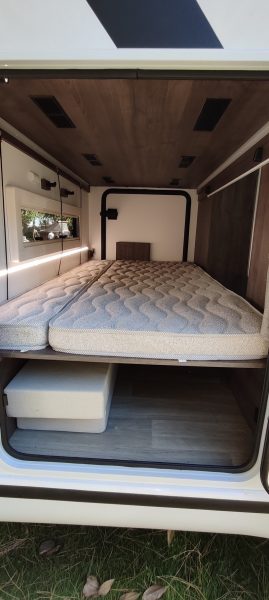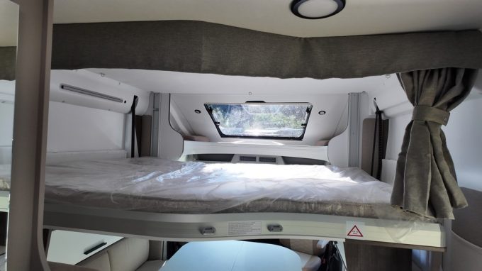 L'ensemble est surmonté d'un grand lit de pavillon double et électrique. En partie arrière, ce modèle inédit embarque des lits superposés logés dans la largeur du véhicule. Les matelas se distinguent par des dimensions très généreuses de 110 cm de largeur et plus de 200 cm de longueur.