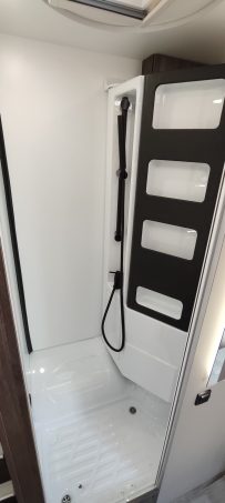 Le couchage inférieur repose sur une planche qui peut si besoin être enlevée afin de libérer du volume en soute. La salle d'eau pour sa part joue la carte d'un compartiment unique avec malgré tout une paroi pivotante afin d'optimiser cet espace et de garantir une bonne isolation de la cabine de douche.