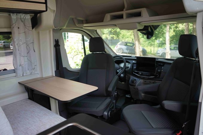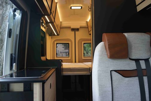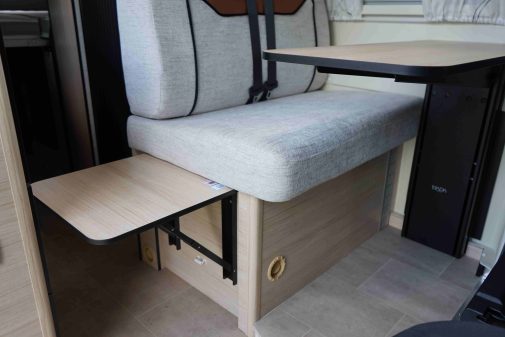 Au niveau de l’ambiance intérieure, la marque du groupe Trigano présente des tons clairs. Du mobilier effet bois se marie avec des tissus gris et des surfaces noires. En plus des fenêtres, beaucoup de LED participent à égayer l’espace de vie.