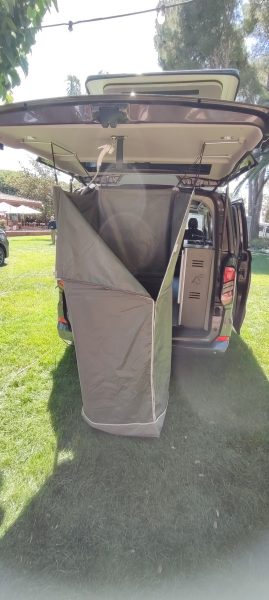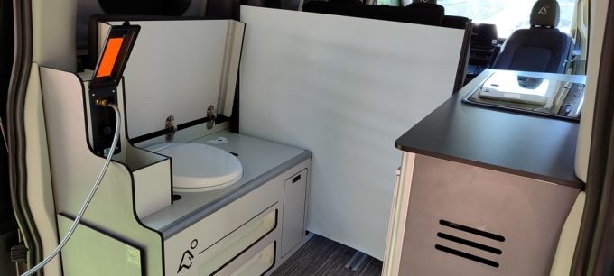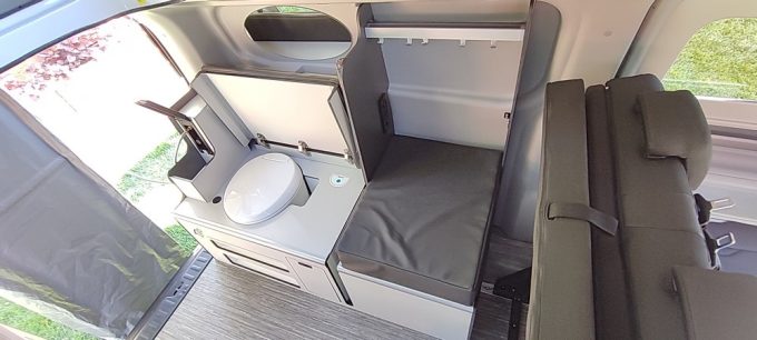 Ce dernier loge un réchaud 2 feux, un évier inox, divers rangement ainsi qu'un frigo à compression de 42 l. Le plus intéressant se situe à l'opposé. Habilement dissimulés dans le mobilier, se trouvent les WC fixes prévus d'origine. Il s'accompagne d'une douchette couplée au chauffe-eau de 8 l pour disposer de l'eau chaude. En revanche, la cabine de douche (sous forme de sac étanche avec bonde d'évacuation intégrée) ne sera disponible qu'en option.