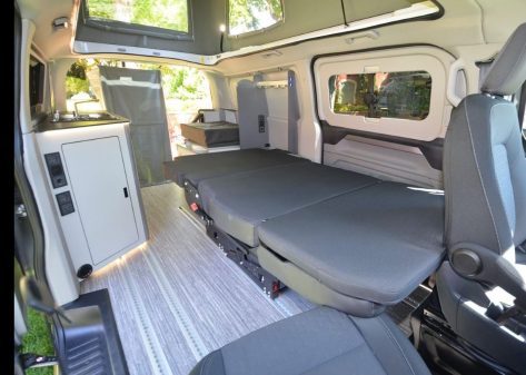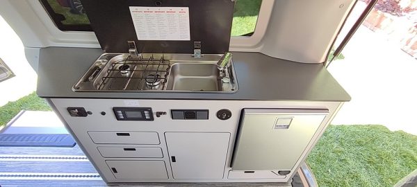 Sur un autre registre, le P59+ utilise pour sa part, la version la plus longue du Custom, soit un gabarit de 5,45 m de long. C'est le moins que l'on puisse faire pour accueillir à bord toutes les commodités dignes d'un fourgon. En effet, ce P59+ dispose d'un grand meuble cuisine sur le flanc droit du véhicule.