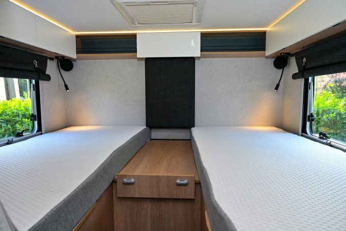 Mais c'est surtout au niveau de l'implantation et de la base qu'il y a le plus de choses à dire. Développées sur le dos du Ford Transit, ces deux nouveautés sont intéressantes à bien des égards. Avec une largeur ne dépassant pas les 2,20 mètres, Bavaria a en effet réussi, comme Pilote, à donner une sensation de grandeur et d'espace saisissante dans un gabarit plutôt réduit, notamment à bord du Q690GJ, qui se démarque par une chambre arrière composée de deux lits jumeaux.