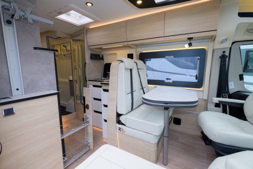 Notre façon de le qualifier n’a pour l’heure pas changer puisque sur un gabarit de 6,36 m de long et 2,05 m de large, il adopte dans l’habitacle un plan axé sur un lit à la française. De plus, la porte coulissante ne donne pas directement sur la cuisine mais sur un sofa logé dans l’entrée et qui vient en complément d’assises du salon. Il sert également de coffre à gaz pouvant accueillir deux bouteilles. Le poste culinaire se trouve donc sur la paroi opposée… comme un profilé. Rapido a opté pour un meuble en L recevant un réchaud deux feux et un évier inox sans oublier les différents rangements en partie haute et basse.