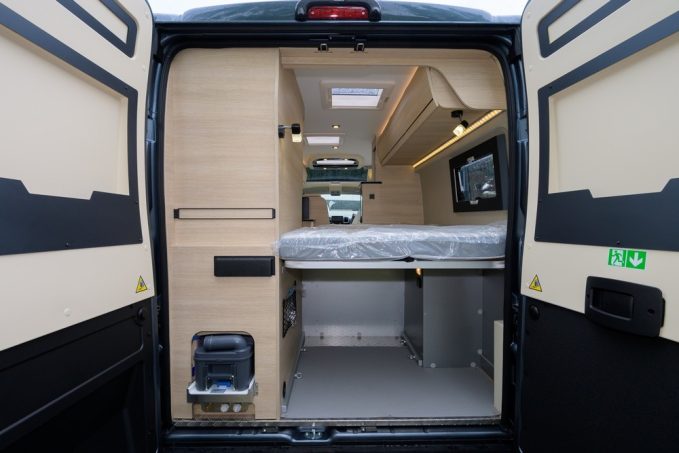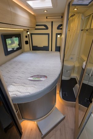 Ce V62 a décidé donc de loger un lit longitudinal. Ce couchage de 125 x 198 cm est positionné assez haut pour profiter de la plus grande largeur de la carrosserie. Pour faciliter l’accès, une astucieuse marche se déploie par simple pression du pied. A côté de ce sommier, l’étroite salle d’eau bénéficie d’un WC, lavabo et cabine de douche. Dommage que cette dernière soit séparée par un simple rideau Nylon.