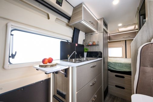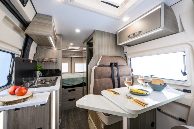 A l’opposé, la dînette se montre conviviale pour quatre personnes. Constituée d’une banquette face route (homologuée pour deux personnes CG), elle s’accompagne également des sièges pivotants du porteur Fiat Ducato. La table plutôt bien dimensionnée profite tout de même d’une rallonge pour plus de confort. C’est également le cas au niveau de la cuisine.
