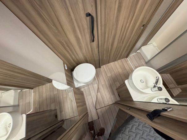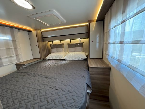 Le 287 TL est aussi un profilé de 7,45 m. Mais lui est pourvu de lits jumeaux. La salle d’eau, quant à elle, est constituée de deux compartiments indépendants pouvant former un vaste cabinet de toilette transversal.