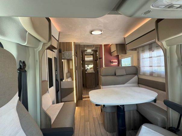 Le 266L TL est un profilé de 7,45 m de long, identifiable à son implantation unique. il est dérivé du Zefiro 266 TL en banquette face-face et intègre une confortable banquette en L pouvant accueillir jusqu’à 5 convives. Nous vous l’avions déjà présenté au printemps 2025.
