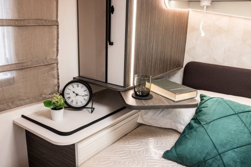 - pour les modèles avec lit central, on soulignera les superbes armoires suspendues, avec étagères pivotantes faisant offices de tables de chevet. McLouis associe l’esthétique au pratique.