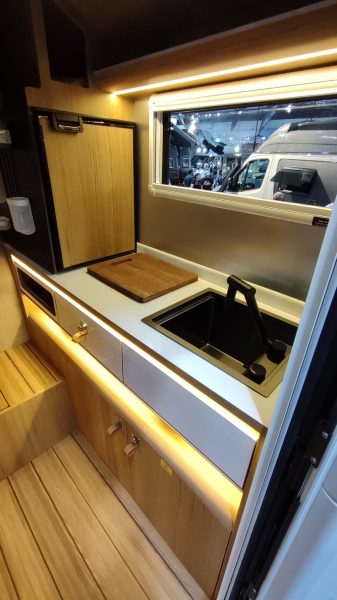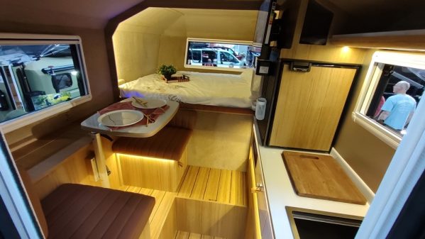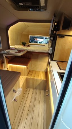 L'entrée s'effectue par la porte arrière qui mène à un habitacle étriqué certes, mais plutôt fonctionnel. La partie capucine bénéficie d'un couchage double permanent plutôt confortable à l'usage. La chambre est précédée sur le flanc gauche d'une dînette pour deux personnes. Le coin repas s'accompagne d'une cuisine bien équipée avec évier, réchaud, frigo de 42 l et différents rangements. La cellule dispose d'une réserve d'eau propre de 50 l et d'eaux usées de 30 l, d'un WC portatif et d'une douche extérieure mais en option.