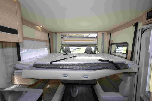 Pour la nuit, les occupants disposent d’un vaste couchage de pavillon qui s’abaisse au-dessus du salon à l’aide d’un moteur électrique. Simple, pratique et rapide. Et comme toujours pour les couchages installés dans les camping-cars de la marque, ceux-ci sont d’un extrême confort car constitué d’un très bon matelas en mousse et d’un sommier à lattes de qualité.