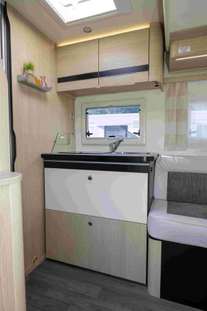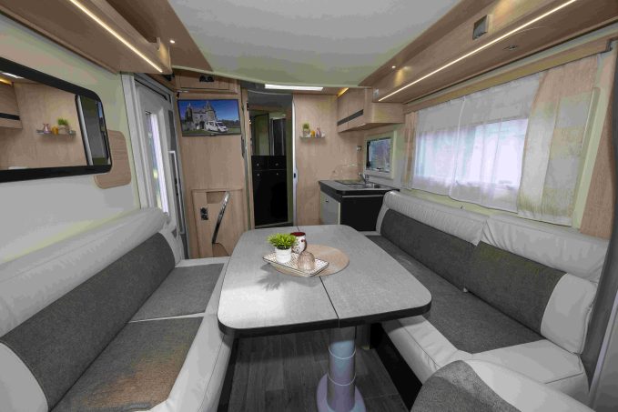 A l’exception de cet appendice, le P660 ne diffère donc pas de son “petit frère” : même implantation avec une dînette identique, une cuisine semblable et la même salle d’eau.
