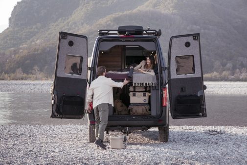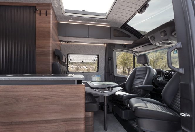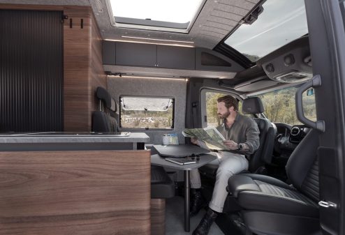 De série, ce véhicule arbore un look agressif certes, mais c’est surtout sous le capot qu’il impressionne le plus : motorisation de 190 ch, boîte auto et évidemment transmission intégrale. L’ensemble est proposé d’origine, au-delà des 140 000 €, un prix qui peut certes faire tiquer. À bord l’agencement convenu se pare d’une ambiance radicalement différente de celle connue à bord des fourgons Twin sur Fiat Ducato. Côté agencement en revanche, pas de surprise. Le slovène opte pour un lit transversal sur soute en partie arrière de 145 x 196 cm.