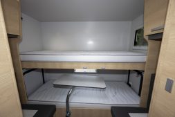 Mais c'est surtout quand le clair de lune est à son zénith que le nouveau profilé Siena 396 fait la différence. Homologué en cinq places couchages, il a en effet été pensé pour garantir de l'intimité à chacun. Si les parents pourront profiter du lit pavillon électrique à l'avant, qui arbore des dimensions de 148/128 x 196 cm, les enfants bénéficieront d'une chambre arrière, qui est l'un des nombreux atouts du véhicule, avec la présence de deux lits superposés, où une tablette vient en complément. De plus, la transformation de la dinette en couchage est également possible.