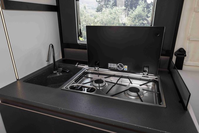 Exemple avec les banquettes latérales qui se transforment rapidement en d’agréables sièges face route, avec le plan de travail de la cuisine en pierre acrylique, très résistant et facile à nettoyer ou encore avec l’installation de série d’un réfrigérateur à compression, toujours plus efficace qu’un modèle à absorption, surtout en période de canicule. La face avant des intégraux Kea a aussi été rectifiée pour recevoir un parebrise plus panoramique qui offre une meilleure vision vers l’avant.