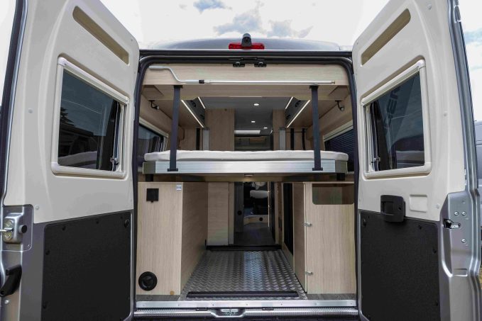 Ses fourgons sont là pour en témoigner, en bénéficiant de l’arrivée d’un mobilier revu et désormais entièrement stratifié, pour une qualité perçue en hausse. Des portes de placards inédites, ainsi qu’une sellerie remaniée, dans des tons blancs et marrons, sont également d’actualité. Mais le lien filial avec Font-Vendôme reste présent. L’ajout au catalogue du R635, sur la même implantation que le Duo Van Garage (p XX), ne dit pas autre chose.