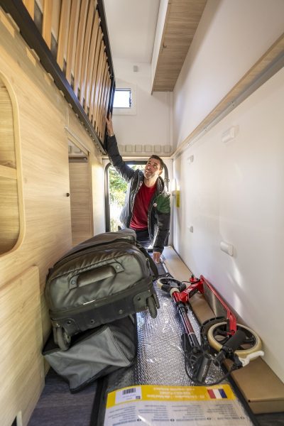 À l’arrière, un lit transversal sur soute avec sommier articulé de type "papillon" permet d’accéder facilement aux rangements ou libère de la hauteur dans la soute. Ce dispositif a déjà fait ses preuves sur le plus petit des Slim, le S514 avec une facilité d'utilisation et une certaine fonctionnalité. La salle d'eau pour sa part fait appel à un compartiment transformable en cabinet de toilette ou douche isolée grâce à la paroi pivotante.