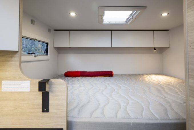 Le S614 se distingue également par la présence d'un lit de pavillon double, de dimensions généreuses compte tenu une fois de plus de la compacité globale (143 x 188/174 cm). Ce dernier logé d'origine reprend le même sommier que celui présent sur les profilés X moins encombrant et plus discret. En revanche, malgré tout la hauteur sous plafond relevé n'est que de 1,77 m en salon, ce qui paraître juste pour certains gabarits de personnes.