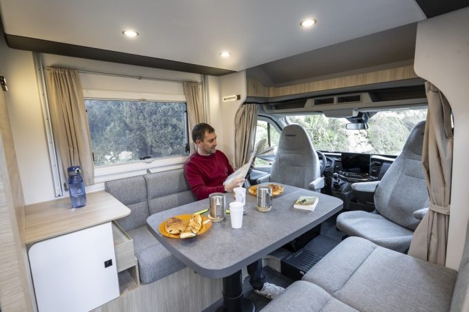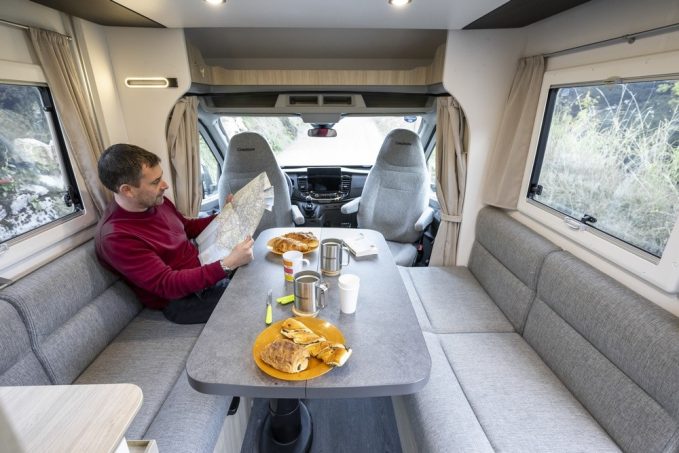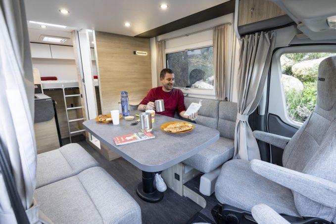 Depuis sa création il y a plusieurs saisons, la série Slim n’a donc eu de cesse d’évoluer. A l’origine bridés sur le châssis cabine du Ford Transit, ces profilés ont pendant une saison été construit sur le Renault Master pour revenir cette année sur Ford, avec en prime une nouvelle implantation. Le lit à la française, trop clivant, est abandonné au profit du S614, qui s’inspire du S514, mais avec 60 cm de plus en longueur. Le gain d’espace permet l’ajout d’un salon face/face très demandé. Plus convivial qu’une banquette en L, il peut accueillir quatre personnes à l’étape. Le véhicule est aussi homologué en 4 places carte grise.