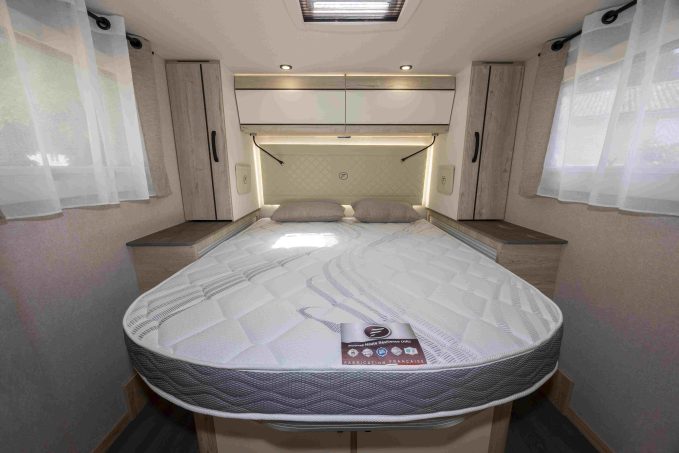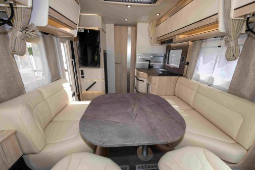 Les ingénieurs et designers de la marque ont tout de même procédé à quelques aménagements. La série Baxter peut en témoigner. Ces profilés compacts sur Fiat Ducato, dont la largeur ne dépasse pas 2,23 mètres, enregistrent en effet une modification au sein de leurs modèles avec le remplacement du 65 LJG par le 69 LJG. Ce dernier se caractérise par une longueur plus prononcée de quarante centimètres, ce qui permet de loger des banquettes latérales face-face, en lieu et place d’une configuration en L. Le bloc cuisine, ainsi que les lits jumeaux à l’arrière, profite également de cet espace supplémentaire en gagnant de précieux centimètres. Le reste de la gamme ne change pas, avec le 60 LG (5,99 m, lit à la française) et le 64 LDF (6,47 m, lit à la française)