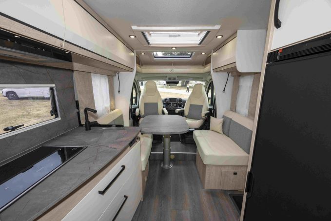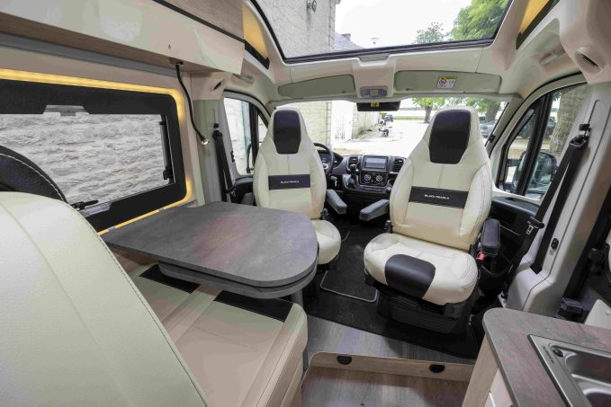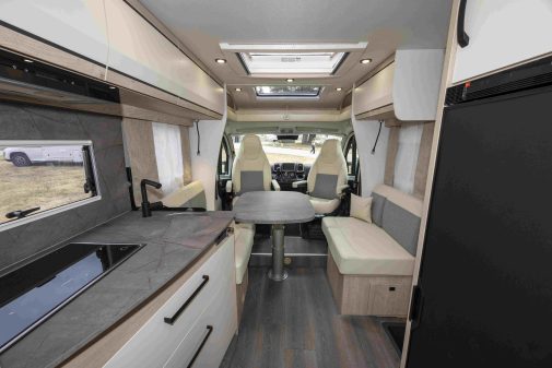Grande nouveauté la saison dernière, les fourgons Black Pearl, à l’ambition premium assumée, sont toujours au catalogue, avec toutefois quelques changements, à l’image d’une évolution du plan de travail mais aussi d’une transformation lit dinette de série passant cette année en option, celle-ci n’étant finalement pas énormément utilisée, en plus de prendre de la place en soute. La construction des deux modèles, en revanche, ne change pas, avec le 59 LT, sur 5,99m lit transversal et le 63 LJG, sur 6,36 m, lits jumeaux.