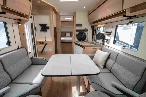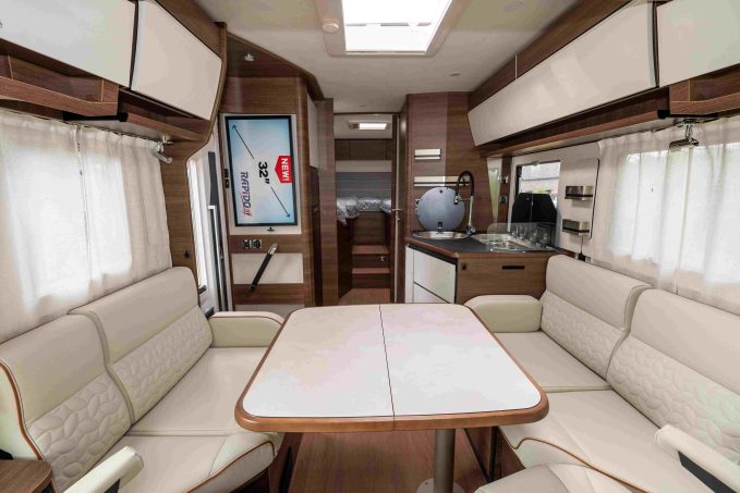 La série 8F se distingue avec l’arrivée du 850F, intégral de moins de 7 mètres équipé d’un grand lit central. Une première ! Ce couchage mesure 150 x 194 cm et sa tête se relève pour libérer les couloirs au pied. La possibilité de modifier la hauteur du lit (et par conséquent celle de la soute) avec un moteur électrique est une des options possibles. La tête de lit est encadrée par deux penderies à portes biseautées, ce qui en facilite l’accès tout en mettant en valeur le mobilier Palatina. La finition Aurora, également disponible, génère une ambiance plus lumineuse.