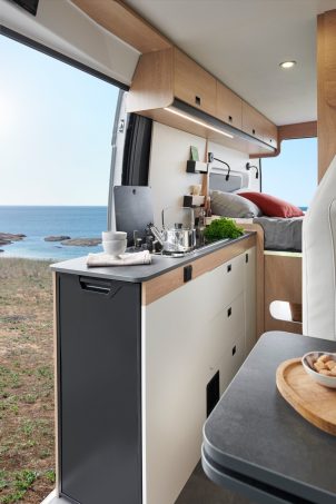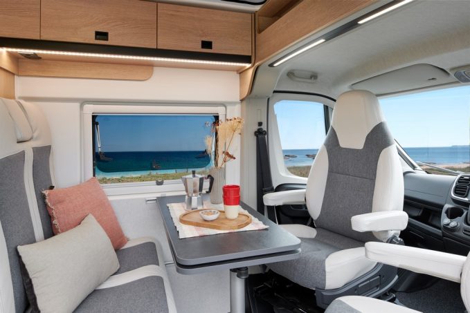 Les nouveaux fourgons Joa by Pilote inaugurent une signature de meubles hauts aux teintes contemporaines, intégrant un rétroéclairage pour un meilleur confort d’usage. La nouvelle sellerie, mêlant simili et tissu dans un esprit très Pilote, améliore le maintien et le confort, avec l’Isofix désormais de série.