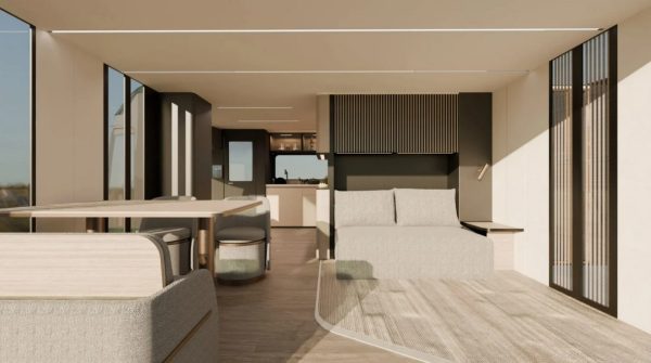 La question est bien évidemment de savoir comment la start-up américaine a procédé pour arriver à un tel résultat ? L'utilisation d'extensions, plus communément appelées slides-out, en est la principale explication, puisque ce AI-THd, c'est son petit nom, est équipé au total de trois slides, agrandissant la surface de vie sur chacun de ses côtés ainsi qu'à l'arrière. Sur la partie gauche, on retrouve par exemple un salon avec vue panoramique, puisque ce camping-car est recouvert en grande partie de surface vitrée. A l'opposé, la cuisine prend place à côté d'une salle d'eau.