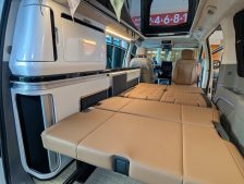 Avec son design si atypique, sous une forme tout arrondie et en douceur, que vient relever la signature lumineuse courant sur l'ensemble de la face avant, le Staria présente un gabarit tout à fait indiqué pour se plier avec réussite à une transformation en van : 5,25 m de long, 1,99 m de large et une hauteur réhaussée à 2,09 m, dans le but de recevoir un toit relevable électrique.