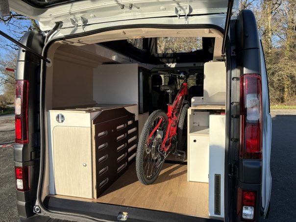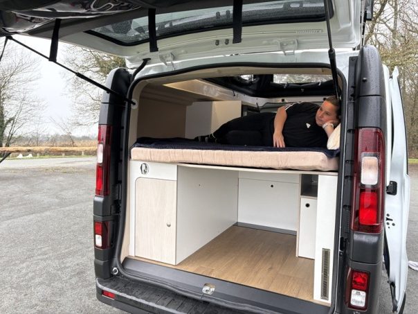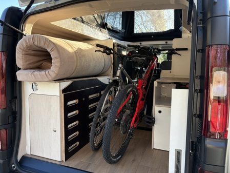 En effet le lit arrière permanent, jusqu’alors installé à demeure, devient amovible permettant donc de profiter d’une soute à géométrie variable. Une première sur les créations de l’aménageur choletais. Les amateurs de vélos ou de sports nécessitant un matériel encombrant apprécieront. La volonté de s’ouvrir à une nouvelle clientèle transparaît clairement dans cette évolution majeure proposée par JCG qui s’accompagne de la disparition de certains rangements (tiroirs sous le lit, placard au-dessus) inhérente à cette nouvelle modularité car leur présence l’entraverait. L’esprit même de ces vans évolue par rapport aux autres modèles de la gamme puisqu’ils délaissent certains équipements de confort (voire de luxe…) devenus standards : ballon d’eau chaude et filtre à eau sont ainsi aux abonnés absents.